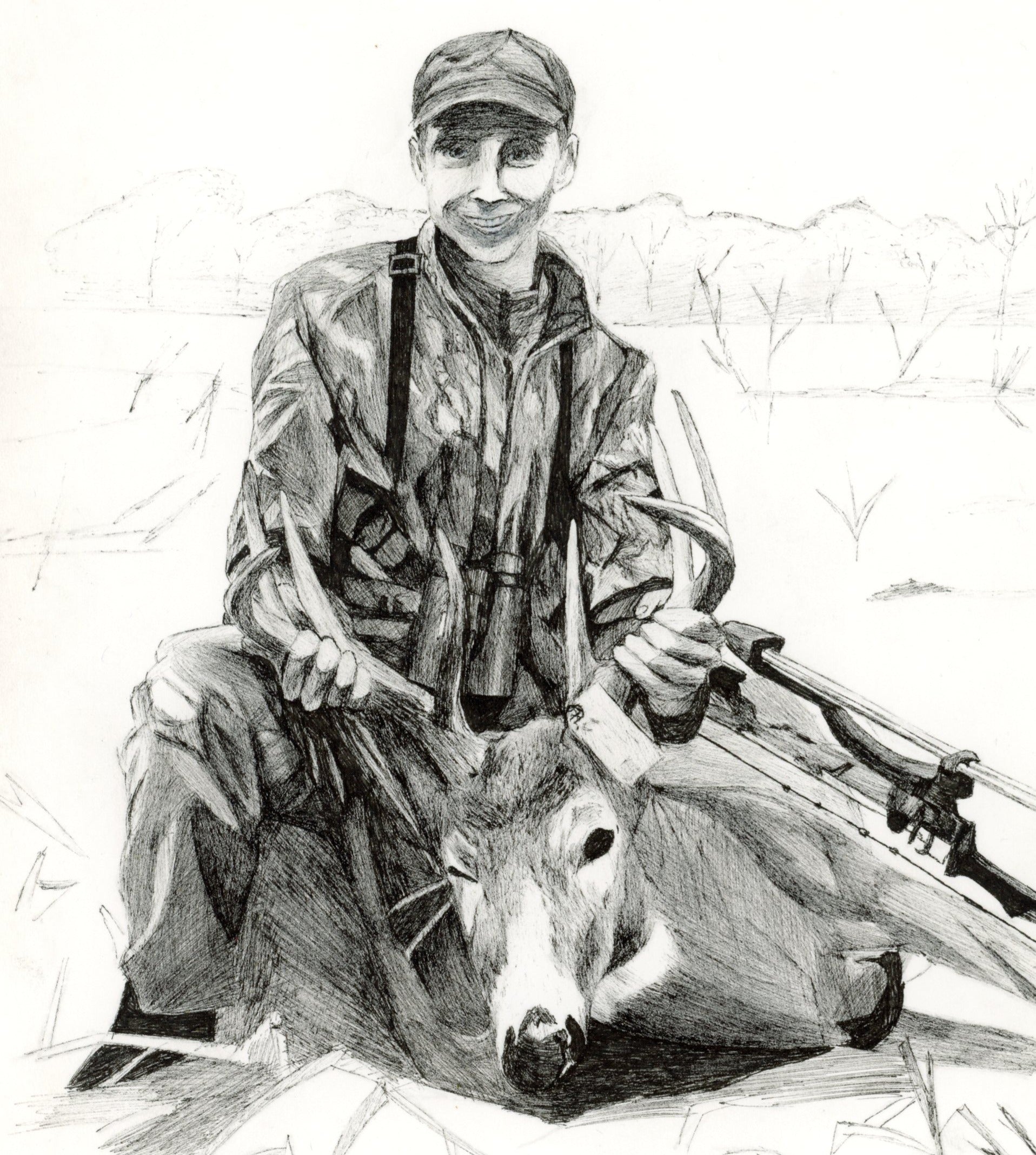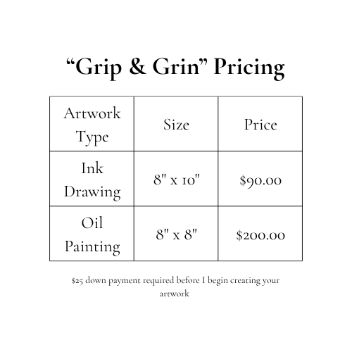 The goal of the "Grip & Grin" artwork is to capture that proud moment when either our own self or a loved one shoots their first deer. Or maybe this isn't there first deer, No matter what I want to capture that moment with a very custom and personal work of art that can be hung up on the wall or place on the mantle. I offer this artwork as an ink drawing or as an oil painting.
