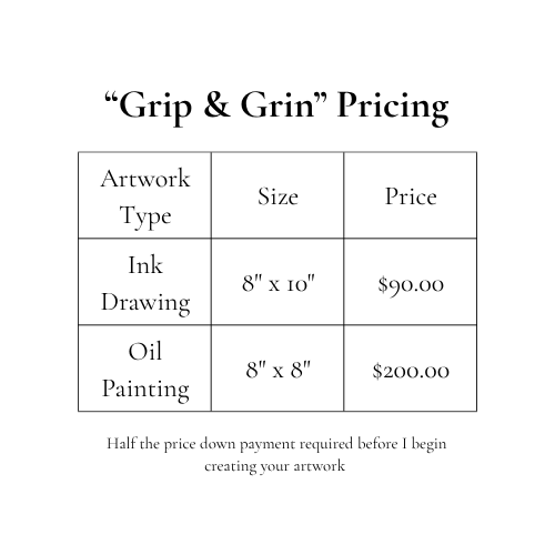 The goal of the "Grip & Grin" artwork is to capture that proud moment when either yourself or a loved one shoots their first deer. Or maybe this isn't there first deer, No matter what, I want to capture that moment with a very custom and personal work of art that can be hung up on the wall or placed on the mantle. I offer this artwork as an ink drawing or as an oil painting.